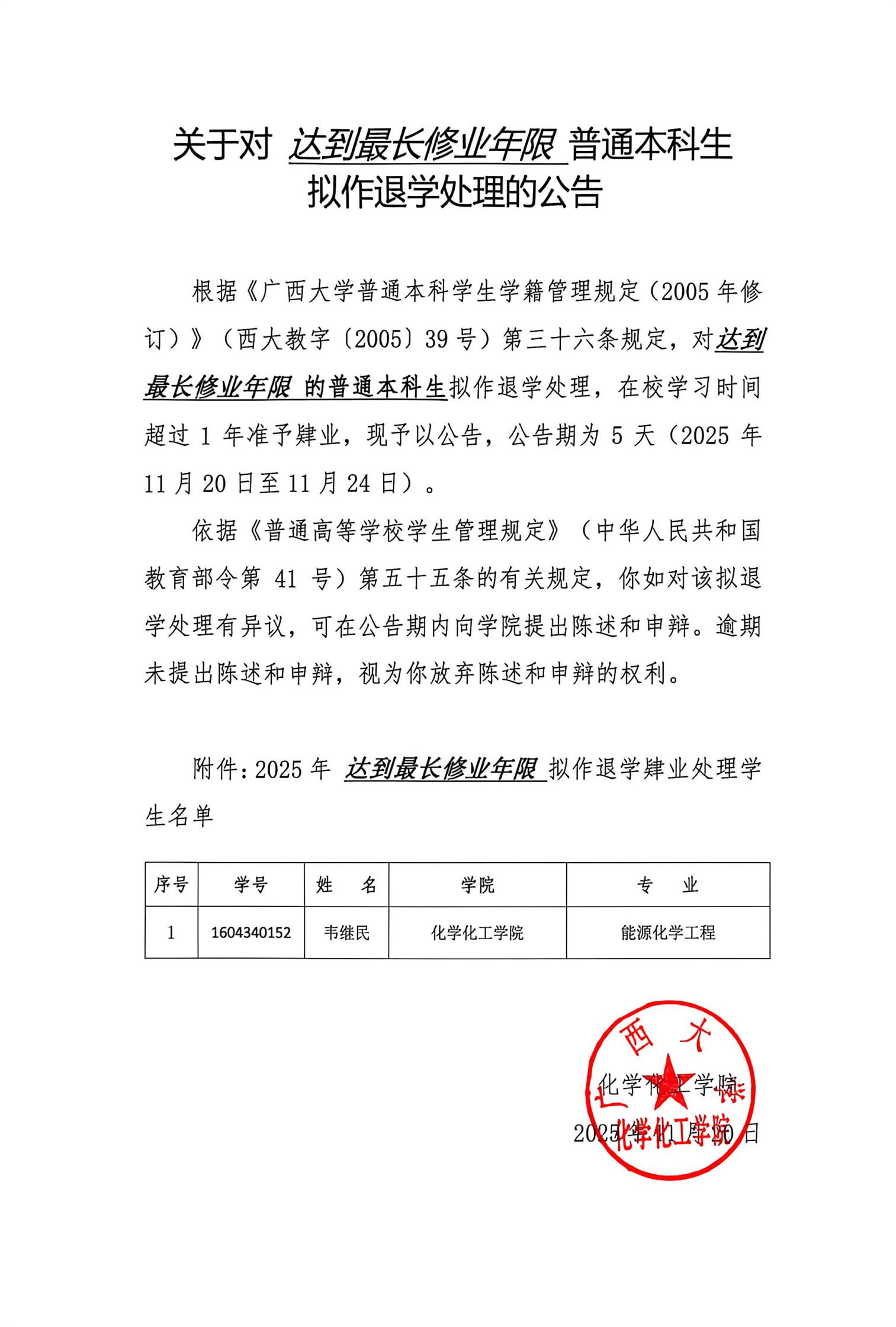 关于对达到最长修业年限普通本科生作退学处理的公告